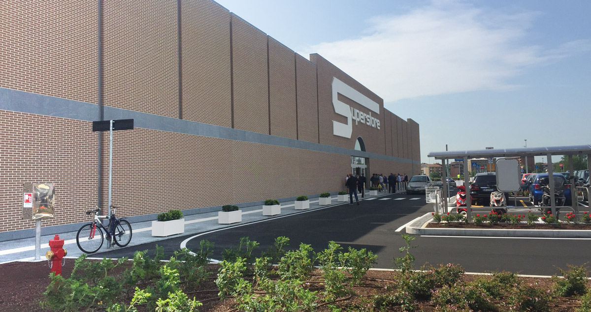 Il nuovo superstore di Saronno (Varese) sarà inaugurato a breve. Il rivestimento è caratterizzato dall’incontro tra il mattone classico sabbiato e la malta bianca, che ne definisce la griglia prospettica ed estetica – tratto distintivo nei centri commerciali di questo marchio della grande distribuzione.